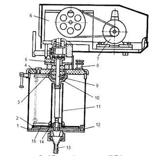 Рисунок 3.4.5. Порошковый дозатор установки УМП-6: 1 – бачок дозатора; 2 – днище съемное; 3 – лопатки верхние; 4 – крышка; 5 – муфта; 6 – редуктор; 7 – электродвигатель; 8 – клапан предохранительный; 9 – валик ротора; 10 – подвеска; 11 – труба центральная; 12 – упор; 13 – воронка с ниппелем; 14 – шнек; 15 – лопатки нижние.