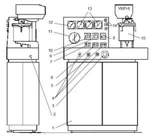 Рисунок 3.4.2 - Пульт управления установкой УМП-6: 1 – пульт управления; 2 – механизм подъема порошкового дозатора; 3 – регулятор подачи порошка; 4 – вентили; 5, 6 – кнопки «пуск»-«стоп»; 7 – тумблеры; 8 и 9 – вольтметры; 10 – амперметр; 11 – термометр манометрический; 12 – манометр водяной; 13 – манометры газовые; 14 – лампы сигнальные; 15 – дозатор порошка.