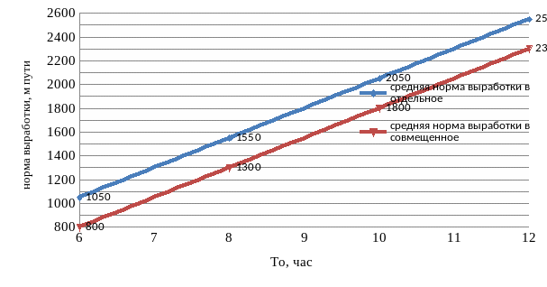 Из графика видно, что фронт выполненных работ в отдельное «окно» продолжительностью 9 часов, составит 1800 метров пути, фронт выполненных работ в совмещенное «окно» продолжительностью 9 часов, составит 1550 метров пути.