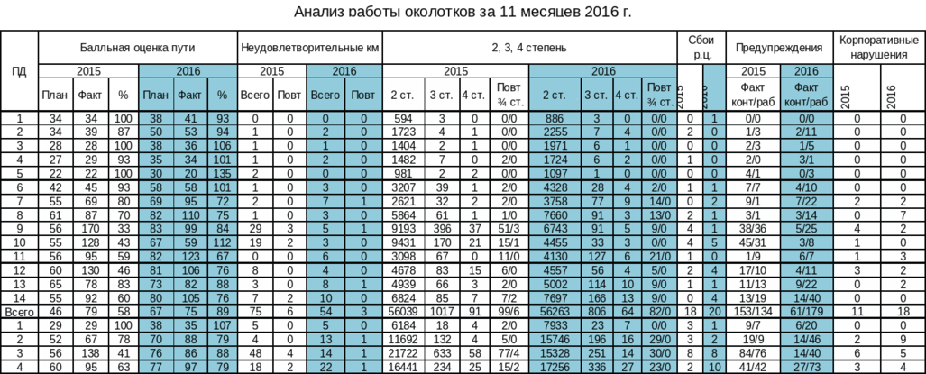 | ПД | Балльная оценка пути | Неудовлетворительные км | 2, 3, 4 степень | Сбои | Предупреждения | Брак | ||||||||||||||||||||||