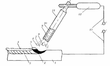 Рисунок 3.2 - Схема ручной дуговой сварки: 1 – основной металл (труба); 2 – сварочная ванна; 3 – закристаллизовавшийся металл шва; 4 – застывший шлак; 5 – расплавленный шлак; 6 – газовая защитная атмосфера дуги; 7 – столб дуги; 8 – капля расплавленного металла; 9 – стержень электрода; 10 – покрытие электрода; 11 – покрытый электрод; 12 – электродержатель; 13 – сварочные провода