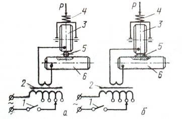 Рисунок 3.5 - Схема установки электроконтакной пайки: а – начальное состояние; б – конечное состояние; 1 – прерыватель тока; 2 – трансформатор; 3 – направляющий ролик; 4 – амортизатор; 5 – присадочная проволока; ; 6 – образец