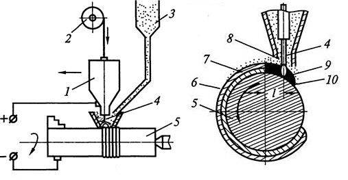 Рисунок 3.4 - Схема электродуговой наплавки деталей: 1 – наплавочный аппарат; 2 – кассета с проволокой; 3 – бункер с флюсом; 4 – проволока электродная; 5 – деталь; 6 – наплавленный металл; 7 – корка шлаковая; ; 8 – флюс; 9 – сварочная дуга; 10 – расплавленный металл