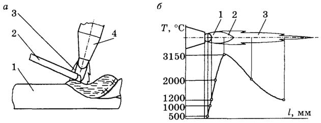 Рисунок 3.3 - Схема процесса газовой сварки (а) и ацетилено-кислородного пламени (б): 1 – заготовка; 2 – присадочный металл; 3 – газосварочное пламя; 4 – мундштука горелки; 1 – ядро; 2 – восстановительная зона; 3 – факел