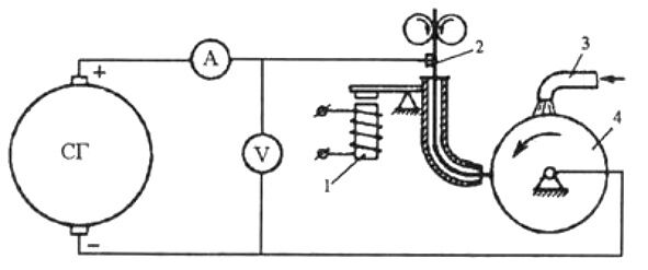 Рисунок 3.6 - Схема вибродуговой наплавки: 1 – источник питания дуги; 2 – вибратор; 3 – электродная проволока; 4 – наконечник; 5 – охлаждающая жидкость; 6 – деталь