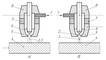 Рисунок 3.7 - Схема плазменной сварки: а – плазменная дуга; б – плазменная струя; 1 – подача газа; 2 – дуга; 3 – струя плазмы; 4 – обрабатываемый металл; 5 – наконечник; 6 – катод; 7 – изолятор; 8 –катодный узел