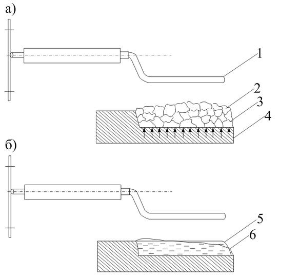Рисунок 3.8 - Схема индукционной наплавки: а – начало процесса; б – окончание процесса; 1 – индуктор ТВЧ; 2 – частицы наплавляемого сплава; 3 – частицы флюса; 4 – деталь; 5 – слой жидкого флюса; 6 – жидкий присадочный сплав
