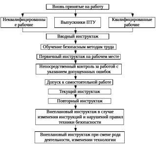 Программа обучения отражает как общие вопросы охраны труда, так и специфические особенности конкретной специальности. В соответствии с действующим порядком рабочие независимо от характера работы, квалификации, стажа при поступлении на работу проходят различного вида инструктажи по технике безопасности (рисунок. 5.2).