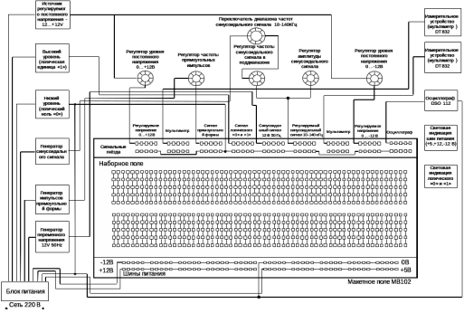 Учебный стенд по электронике относится к области обучающих устройств и может быть использован для получения практических навыков работы с аналоговыми и цифровыми электрическими схемами во время проведении лабораторных работ и научных исследований. Стенд содержит корпус, внутри которого установлены блок питания, генератор синусоидальных сигналов, генератор прямоугольных импульсов, генератор логического 0 или 1, на лицевой стороне которого размещены макетное поле, переключатель частоты синусоидального сигнала, регулятор амплитуды синусоидального сигнала, два регулятора напряжения от 0 до +12 и от 0 до -12 В, два мультиметра, осциллограф с сенсорным управлением и датчики индикации. В качестве макетного поля выбрано макетное поле марки MS-102 с сигнальными гнездами, объединенными в группы, предназначенными для подачи входного сигнала различной формы на исследуемую электрическую схему, с монтажными гнездами, предназначенными для установки исследуемых элементов электроники и с шинами питания.