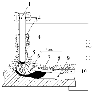 При автоматической сварке под слоем флюса (рис. 2.1) плавление присадочного металла происходит за счет тепла, выделяемого дуговым разрядом, возникающим между свариваемым изделием 5 и электродом 1.