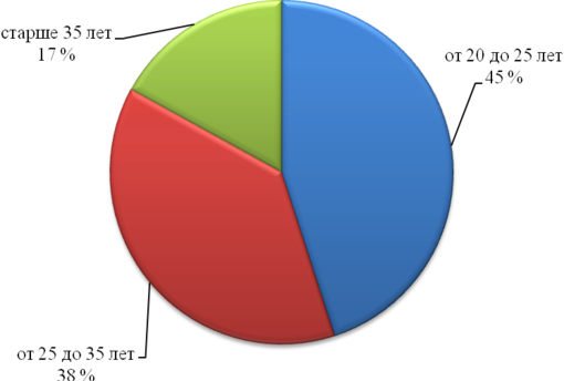 По возрастному признаку, как видно из рисунка 2.4, 45 % основной массой является молодое поколение, от 20 до 25 лет; 38 % поколение от 25 до 35 лет; 17 % сотрудники старше 35 лет.