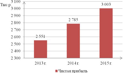 Чистая прибыль ООО «Строительные материалы ДВ» под влиянием вышеперечисленных факторов увеличилась в 2015 году на 218 тыс. р. по сравнению с 2014 годом и концу 2015 года ее величина составила 3003 тыс. р. Изобразим динамику чистой прибыли ООО «Строительные материалы ДВ» на рисунке 7.