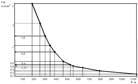 Определяем расстояния для избыточных давлений D Рф соответственно для 3,0; 2,0; 1,0; 0,5; 0,3; 0,2; 0,1 кгс/см2 при взрыве ГВС от 200 т дизельного топлива: