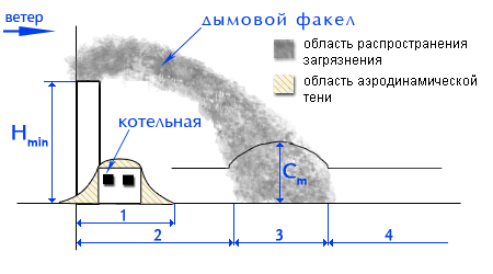 1 – зона неорганизованного загрязнения; 2 – зона переброса факела (небольшие концентрации загрязняющих веществ); 3 – зона задымления (на расстоянии 10 – 40 Hmin);4 – зона снижения уровня загрязнения.