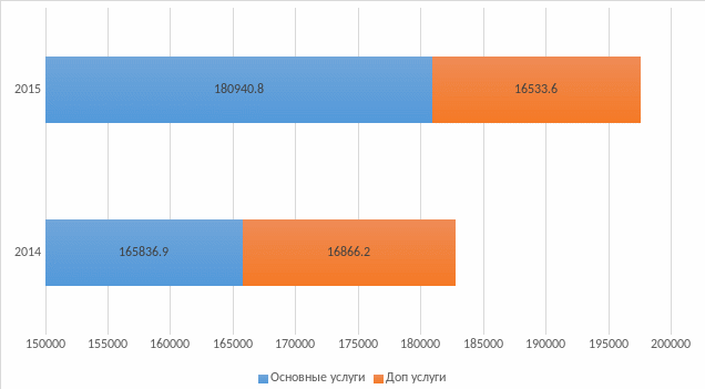 Сравнивая состав и структуру доходов «Глобал» с 01.01.2014 по 31.12.2015 следует сделать следующие выводы. Рассматривая по полугодиям выручку от продаж клубных карт (основные услуги), необходимо отметить спад продаж, приходящийся на первое полугодие 2015 г. Для решения возникшей ситуации руководством было принято решение пригласить специалиста, а именно, тренера по продажам из столицы для поднятия показателей продаж. Как показывает величина доходов от основных услуг во втором полугодие 2015 г., тренинги и обучение менеджеров по повышению продаж дали свои результаты. Но все же, показатели второго полугодия 2015 года не дотягивают до показателей второго полугодия 2014 года, т.к. обуславливается ещё и сложной экономической ситуацией в стране. Но в целом, в 2015 году прослеживается прирост доходов от основных услуг на 9,1%.