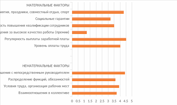 Исследуя оценку удовлетворенности существующих материальных и нематериальных факторов следует отметить, что наибольшая удовлетворенность материальными ресурсами отмеченная респондентами является регулярность выплаты заработной платы и корпоративные мероприятия, праздники, совместный отдых, спорт. Однако основное недовольство выражено в вознаграждениях за высокое качество работы (премии). Говоря о нематериальных факторах, сотрудники клуба выше всего оценивают отношения с непосредственным руководителем