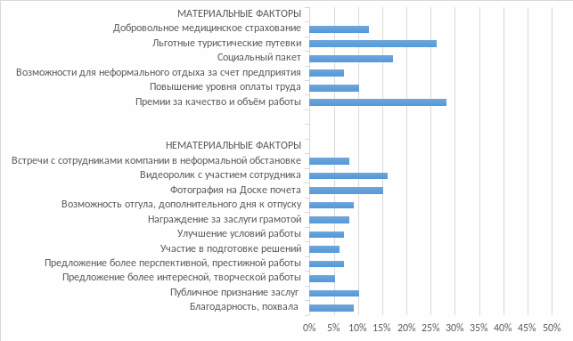 Анализируя результаты таблицы 17, высокий процент опрошенных считает, что наиболее эффективный фактор стимулирования, который может повысить мотивацию - премии за качество и объём выполненной или перевыполненной работы