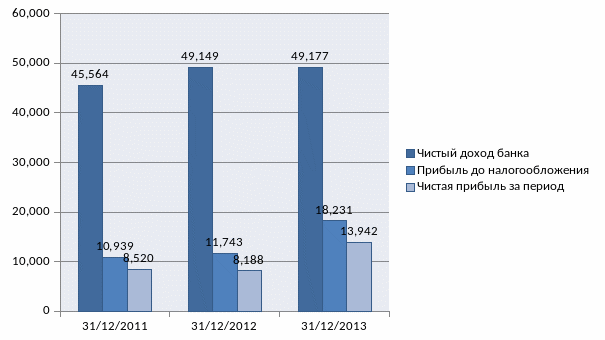 В целом чистая прибыль за периоды имеет стабильную возрастающую динамику. В 2015 году читая прибыль банка возросла на 70%. Однако показатель чистой прибыли за 2014 год ниже аналогичного показателя 2013 года на 3,9%. Динамика прибыли банка отражёна на рисунке 3.
