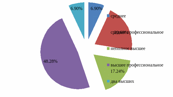 Анализ показал, что 48% численности сотрудников имеют высшее профессиональное образование, 7% два высших образования. Остальные 45% работников имеют среднее, среднее профессиональное и незаконченное высшее образование, что указывает на имеющиеся резервы в развитии трудового потенциала.