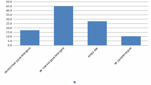 5 человек (17,3%) удовлетворены своим заработком, 44,8 % респондентов не в полной мере удовлетворены заработком, 27,6% не всегда устраивает заработок. Если учесть, что к своему денежному вознаграждению человек привыкает уже за 3 месяца, а затем его начинает не хватать, вне зависимости от размера, то преобладание таких неопределенных ответов, как «не совсем» и «когда как», вполне закономерно и отражает ситуационный характер мотивации. 3 сотрудника (10,3%) совсем не удовлетворены своим заработком. Это, несмотря на то, что в Кредитном отделе средняя заработная плата в 2015 г. составляла 39 018 руб. (среднемесячная заработная плата за январь-декабрь 2015 г. по Хабаровскому краю составила 38 027руб. [55]).