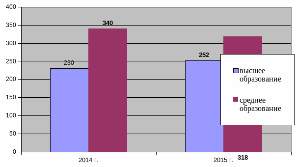 Из рисунка 8 следует, что по сравнению с 2014 годом, на 3,6 % увеличилось количество сотрудников, имеющих высшее профессиональное образование, на 19,2%, имеющих среднее профессиональное образование.