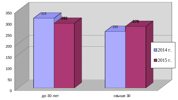 Рисунок 9 показывает, что количество лиц, имеющих возраст до 30 лет в 2015 г. составил 38,5% от общего числа работающих, тогда как в 2014 г. указанный процент составил 38,1%. Количество работников в возрасте 30 лет и старше существенно не изменилось в меньшую сторону в 2015 г. - 25,8% от общего числа работников, в 2014 г. – 24,1%.