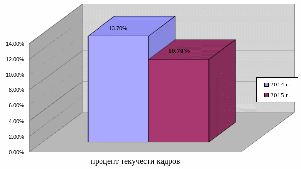 Таким образом, процент текучести кадров за 2015 г. составил 10,7 % от численности персонала ООО «Дальстрой», что на 3 % ниже, чем в 2014 г., но остается высоким и в два раза превышает естественный уровень.