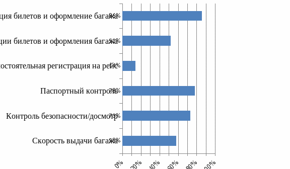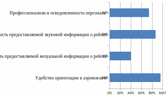 Респонденты положительно оценили удобство ориентации в аэровокзале, отметили наличие хорошо читаемых указателей, так же высоко оценили доступность, полноту, оперативность и своевременность звуковой информации о рейсах, но достаточно плохо – визуальную информацию, по словам респондентов, информационные табло подвешены слишком высоко, а шрифт на экране достаточно мелкий и не позволяет разглядеть интересующую информацию.