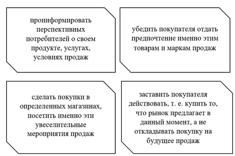 Продвижение (разработка и реализация рекламных мероприятий, стимулирование продаж, в том числе и персональных, организация связей с общественностью).