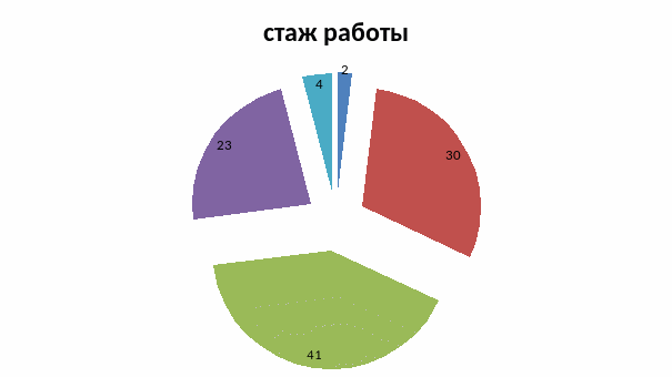 Так большинство опрошенных указало, что их стаж работы 6-10 лет (41%), 30% опрошенных со стажем работы 2 года- 5 лет, 23% респондентов со стажем 11-20 лет, наименьшее число опрошенных со стажем работы более 21 года(4%) и стажем менее года (2%).