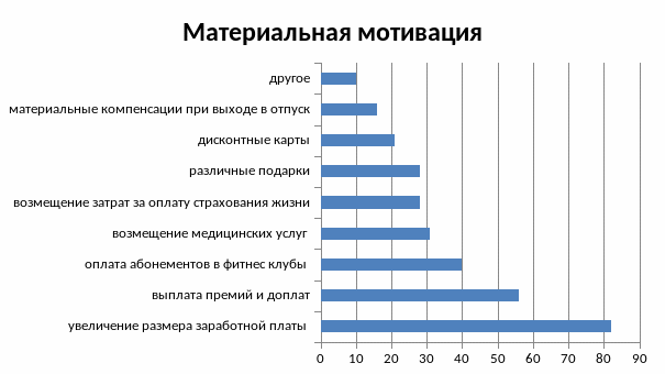 Наиболее предпочтительным видом материальной мотивации является увеличение размера заработной платы (82%), выплата премий и доплат (56%), оплата абонементов в фитнес клубы (40%), возмещение медицинских услуг (31%), возмещение затрат за оплату страхования жизни, здоровья и различные подарки набрали одинаковое количество 28%. Наименьшее количество опрошенных выбрало пункты дисконтные карты на покупку каких-либо товаров(21%),материальные компенсации при выходе в отпуск(16%). 10% опрошенных выбрали категорию "ваш вариант", где большинство так и не указало своего варианта, но некоторые отметили, что им необходимы бесплатные обеды, бесплатный паек на смену.