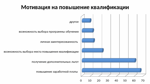 На вопрос что могло бы мотивировать на повышение своей квалификации, получение дополнительного образования, наиболее популярным ответом среди опрошенных является повышение заработной платы (66%) и получение дополнительных льгот за повышение квалификации (60%).