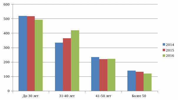 | До 30 лет | 520 | 42 | 518 | 42 | 493 | 39 |
