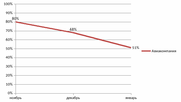 Мы видим, что пассажирская загрузка АО «Авиакомпания "Аврора" в ноябре на 3% выше, чем в ПАО "Авиакомпания Сибирь", но в декабре и январе АО «Авиакомпания "Аврора" перевезла на 2% меньше пассажиров, чем ПАО "Авиакомпания Сибирь", а в январе 2017 года на 3% меньше.