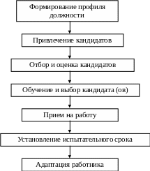 Рисунок показывает, что процесс подбора персонала начинается с формирования профиля должности. Данный профиль включает в себя профессиональные знания и навыки, необходимые для выполнения данной работы, компетенции, а так же личностные особенности, соотносящиеся с корпоративной культурой и внутренними, порой неформальными правилами компании, а также анкетные данные. Формирует данный профиль руководители подразделений.