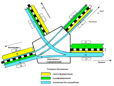 Рисунок 2.1. Диаграмма существующих поездопотоков по станции Комсомольск-СортировочныйСерии поездных локомотивов по каждому направлению представлены в таблице 2.2.