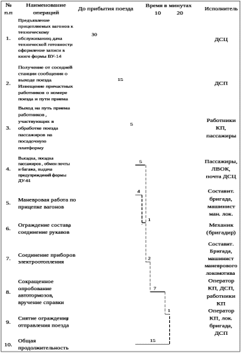 - прицепляемая группа вагонов подготавливается заранее и ставится на одном из путей, смежным с путём приёма поезда, для предъявления их к техническому осмотру за тридцать минут до прибытия пассажирского поезда;
