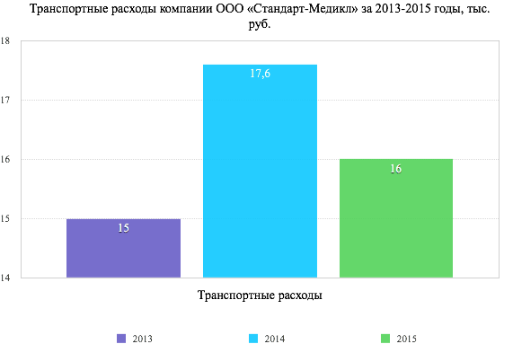 Таким образом, можно наблюдать снижение транспортных расходов компании ООО «Стандарт-Медикал» в 2015 г., по сравнению с 2014 г., и повышение транспортных расходов в 2014 г., по сравнению с 2013 г.