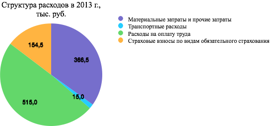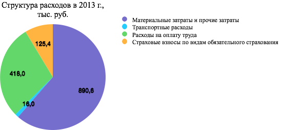 В 2013 году наибольший удельный вес в структуре раходов предприятия занимали расходы на оплату труда (49%), затем материальные и прочие затраты (34,87%).