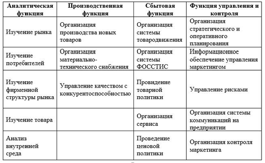 Функция маркетинга включает следующие подфункции: маркетинговые исследования, планирование, ценообразование, маркетинг-менеджмент, распределение и продвижение товара. Их перечень приведен в таблице 1.