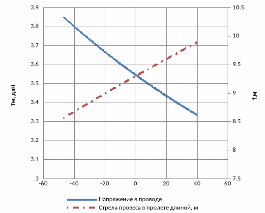 Далее представлен рисунок, показывающий зависимость, напряжения провода и стрелу провеса от температуры.