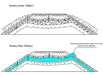 При оттаивании распученного грунта жидкость поднимается из холодного места в более теплое, подпитываясь грунтовыми водами, скапливается между балластом и основанием насыпи разжижая грунт. Жидкость находится под давлением и при воздействии нагрузок вместе с переувлажненным грунтом «выдавливается» из-под балластной призмы – происходит выпор грунта (рисунок 7.1).
