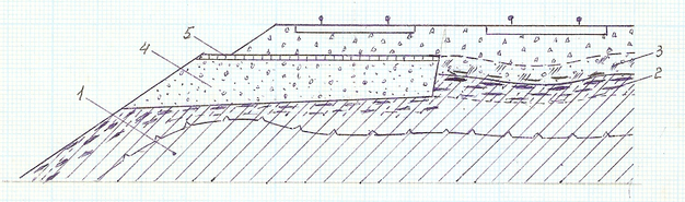 1 – щебень балластной призмы; 2 – старый балласт сильно грязный; 3 – Распученный линзами льда грунт; 4 – граница промерзания грунта; 5 – грунт насыпи (суглинок).