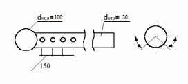 Диаметр ответвлений при расходе на одно ответвление Q=0,0027 м3/с и скорости 3 м/с, составит 30 мм. Общее количество отверстий на одно ответвление определится по зависимости: