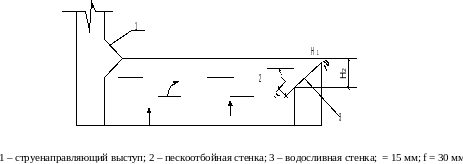 Водосливная стенка должна устраиваться вдоль стены сборного канала под углом 450 внутри фильтра, причем верхняя кромка отбойной стенки должна быть ниже верхней кромки водосливной на Н1 = 170 мм. Нижняя кромка отбойной стенки не должна доходить до водосливной, образуя в нижней части пескоулавливающего желоба продольную щель = 15 мм. Нижняя кромка водосливной стенки должна на 30 мм перекрывать нижнюю кромку отбойной стенки. Нижнюю кромку водосливной стенки надлежит принимать на 100 мм выше поверхности фильтрующей загрузки. Разность верхней и нижней кромок водосливной стенки 170 мм.