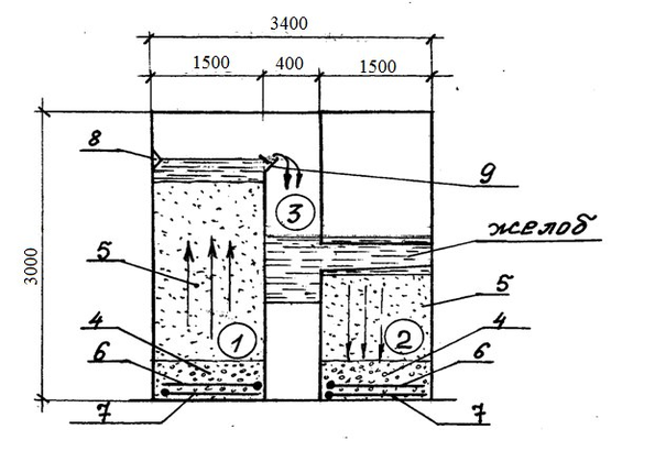 1- первая ступень 2- вторая ступень 3- карман 4- поддерживающий слой 5- рабочий слой (фильтрующий) 6- водяная распределительная система 7- воздушная распределительная система 8- струенаправляющий зуб 9- водослив.