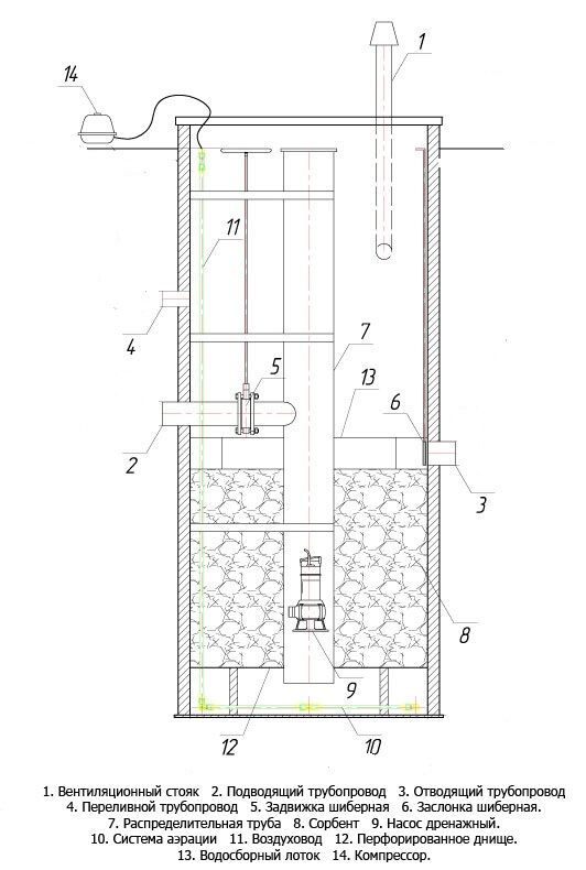 Работа погружных насосов автоматизирована в зависимости от уровней стоков в приемном резервуаре: