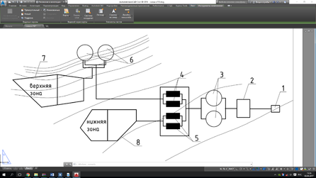 1 – водозаборные сооружения из подземного источника; 2 – очистные сооружения (цех обеззараживания); 3 – резервуары чистой воды; 4 – насосы верхней зоны; 5 – насосы нижней зоны; 6 – резервуары чистой воды верхней зоны; 7 – водопроводная сеть верхней зоны; 8 – водопроводная сеть нижней зоны.