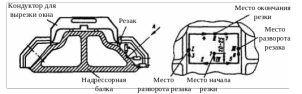 - в стенке наклонной плоскости вырезается окно. При вырезке, поврежденной или изношенной наклонной плоскости следует использовать ручную кислородную резку. В процессе резки мундштук резака опирается на внутреннюю кромку отверстия соответствующей стороны кондуктора. Положения резака, последовательность выполнения резки и размеры вырезаемого окна по наружным кромкам реза приведены на рисунке 2.3. Резка осуществляется за два прохода по контурам 1-2-3-4 и 5-6-7. В процессе резки, не прекращая ее в местах поворота, изменяют положение резака на 90° на середине участков I и III;