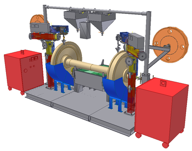 На установке выполняется автоматическая электродуговая наплавка под слоем флюса.
